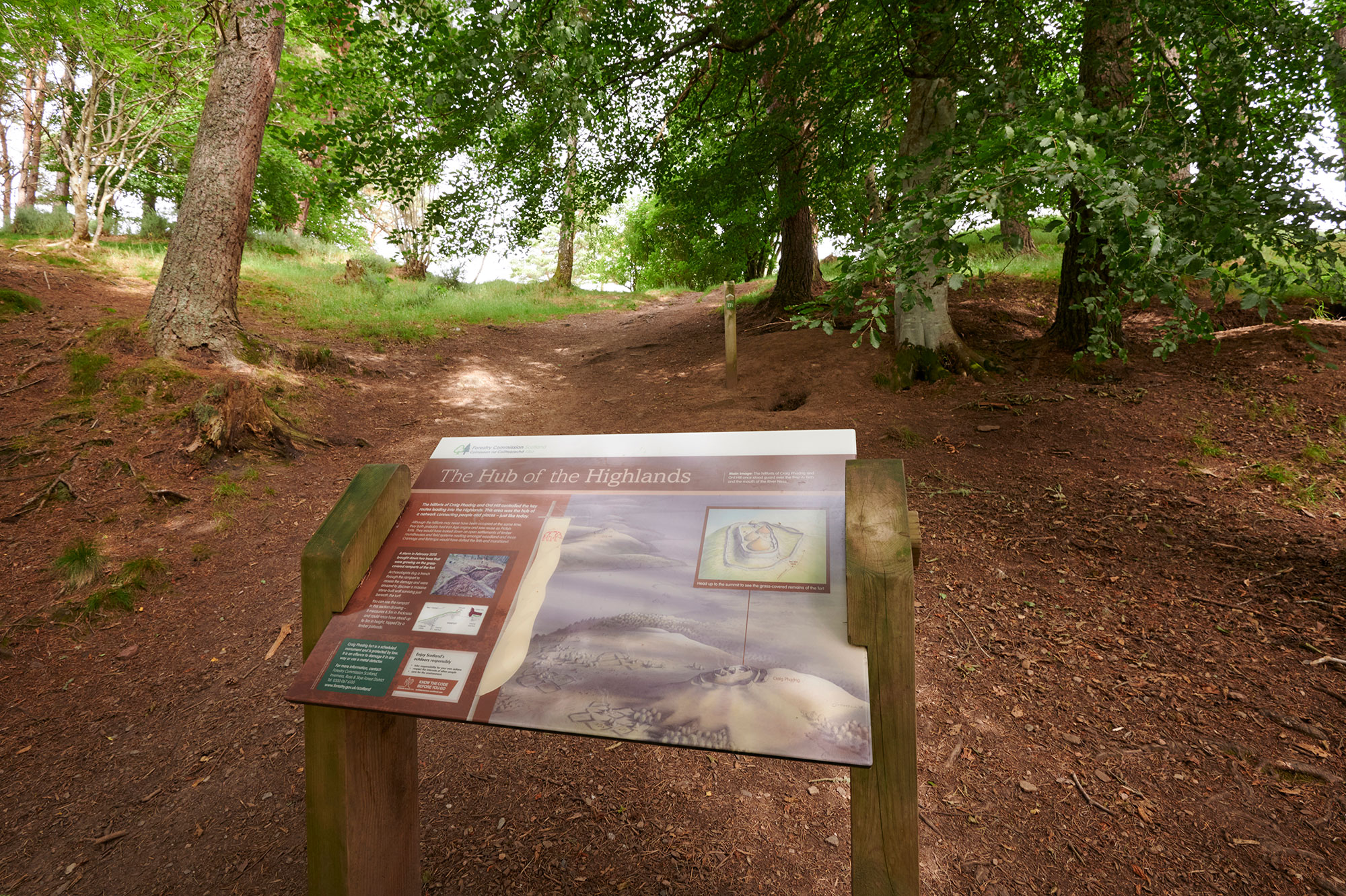 Today, the ramparts are easy to see around the edge of the top of the hill. Imagine all the comings and goings as you explore the forest, with wide-ranging views through the trees, including to Ord Hill, another ancient hill fort just across the Beauly Firth.