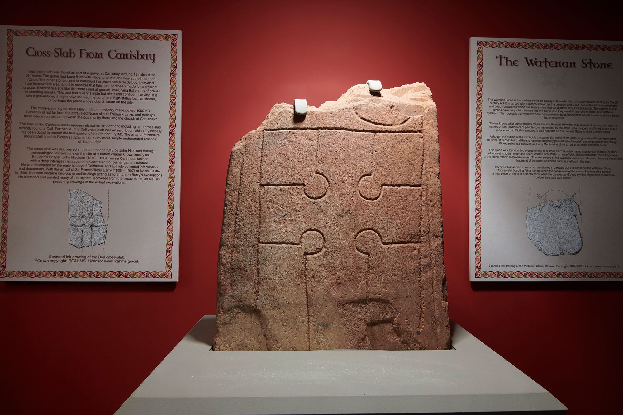 A fascinating collection of three Pictish carved stones from Caithness – the Skinnet Stone with its elaborate interlacing and a rare Pictish depiction of a horse-drawn chariot; the Ulbster Stone with its crosses flanked by numerous symbols and animals; and the earlier Watenan Stone with its crescent and V-rod symbol.