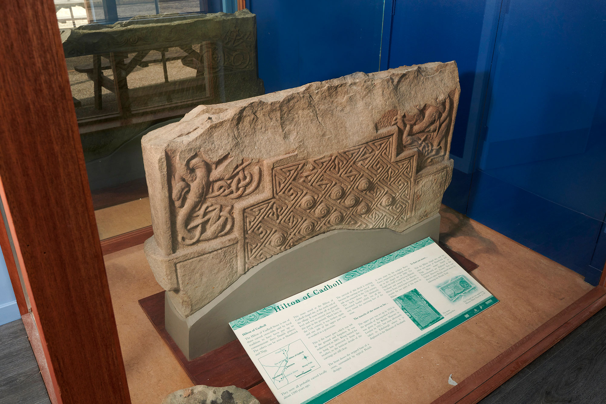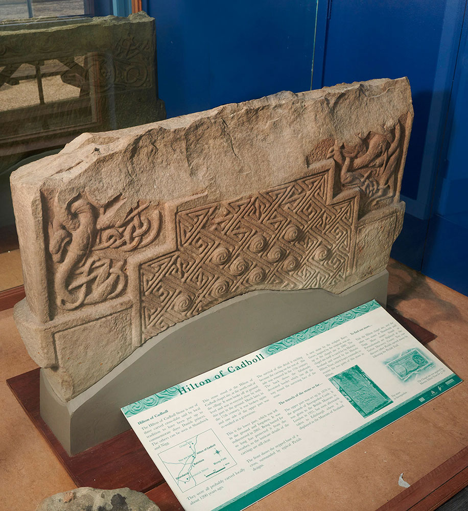 The original carved base of the magnificent Hilton of Cadboll Pictish stone whose replica is situated a short walk from the Seaboard Centre. Buried for centuries after the upper part of the original stone toppled and broke, the base was protected underground, meaning that its intricate carvings – decorative key patterns and interlaced beasts – have been beautifully preserved.