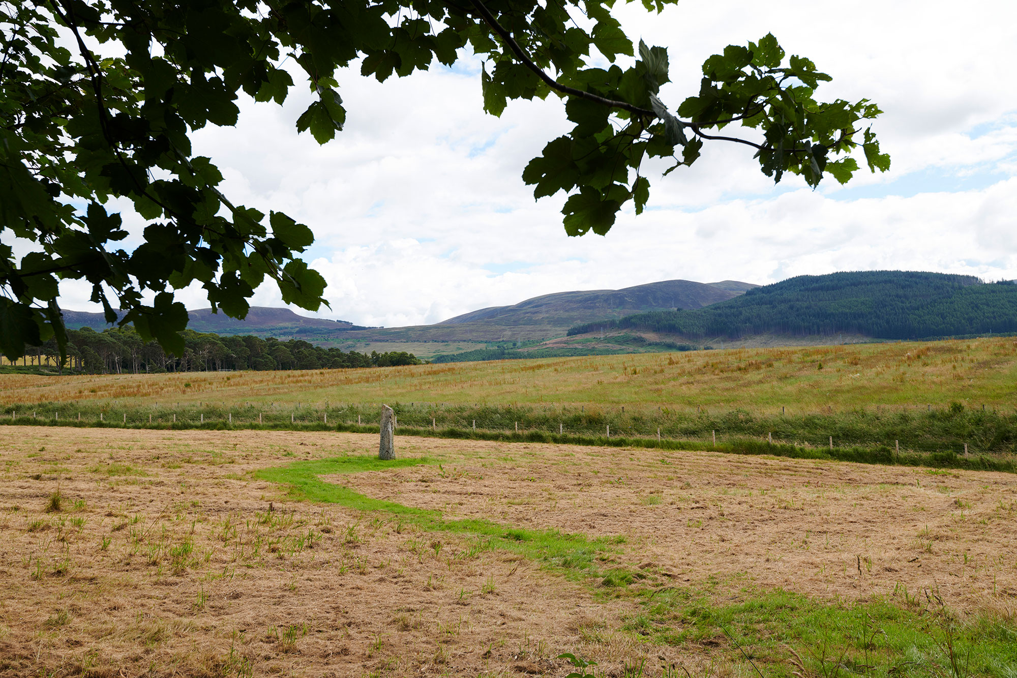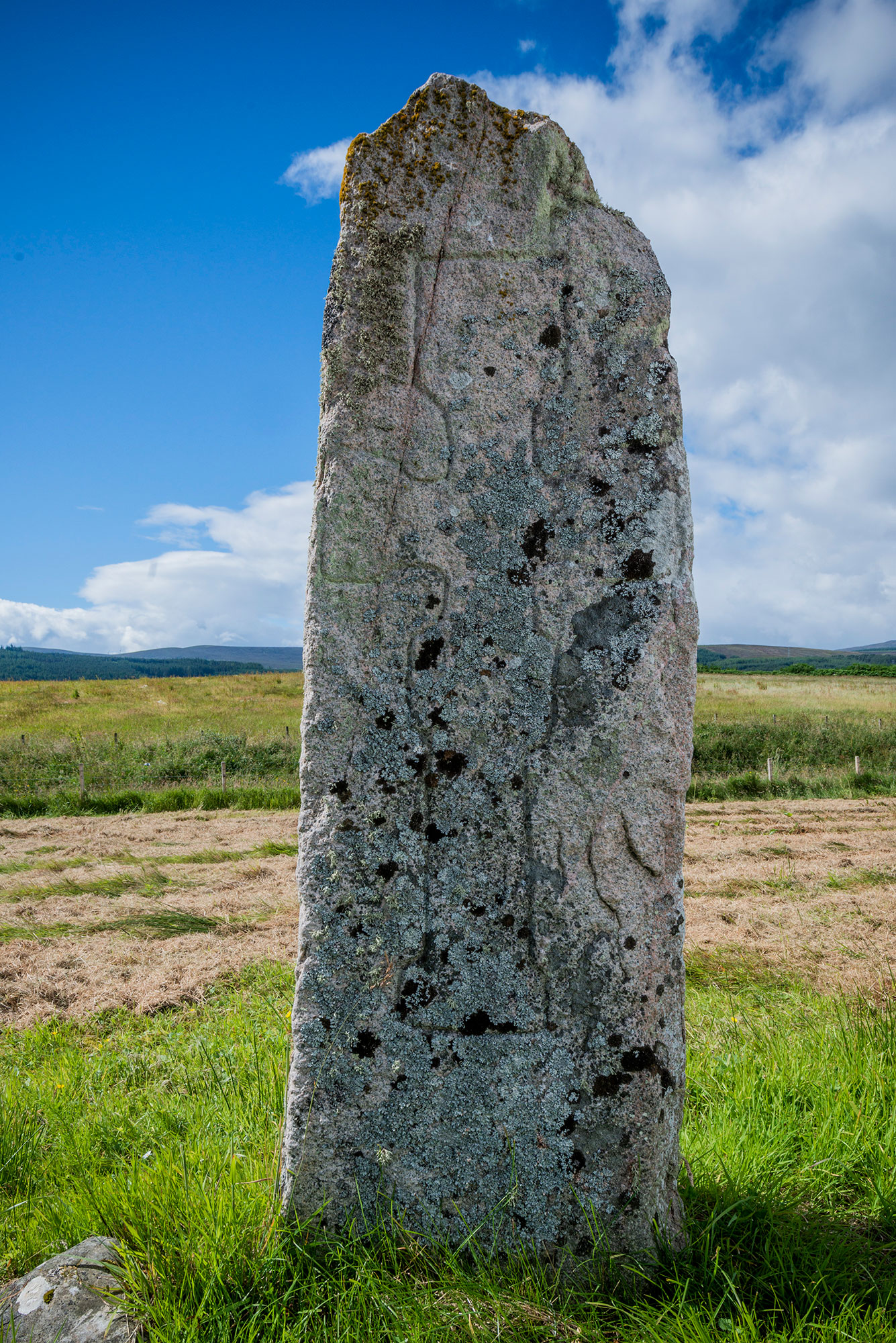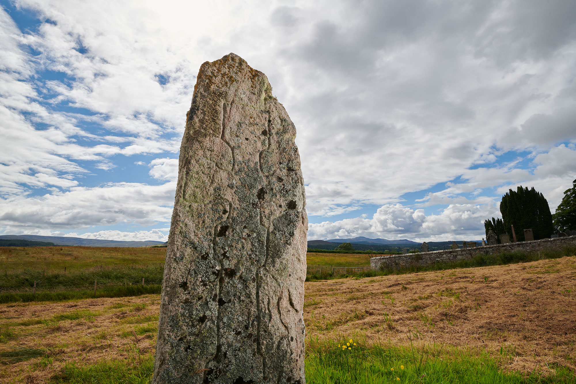 Information panel located at entrance to Little Creich cemetery which is also the best place to park. To reach the stone, follow the path through the cemetery from the carpark, go through gate and walk to brown sign marker at layby end. The stone is located through gate and 100m across rough grazing land.