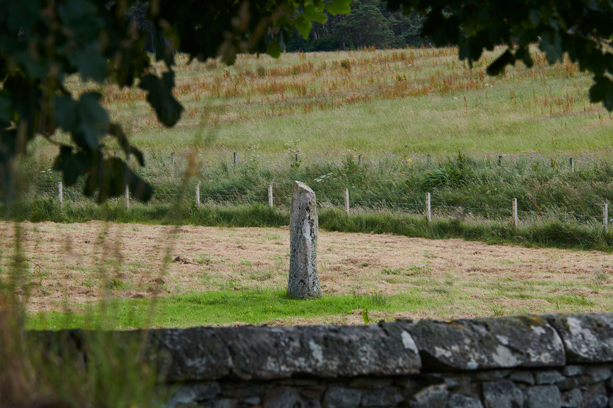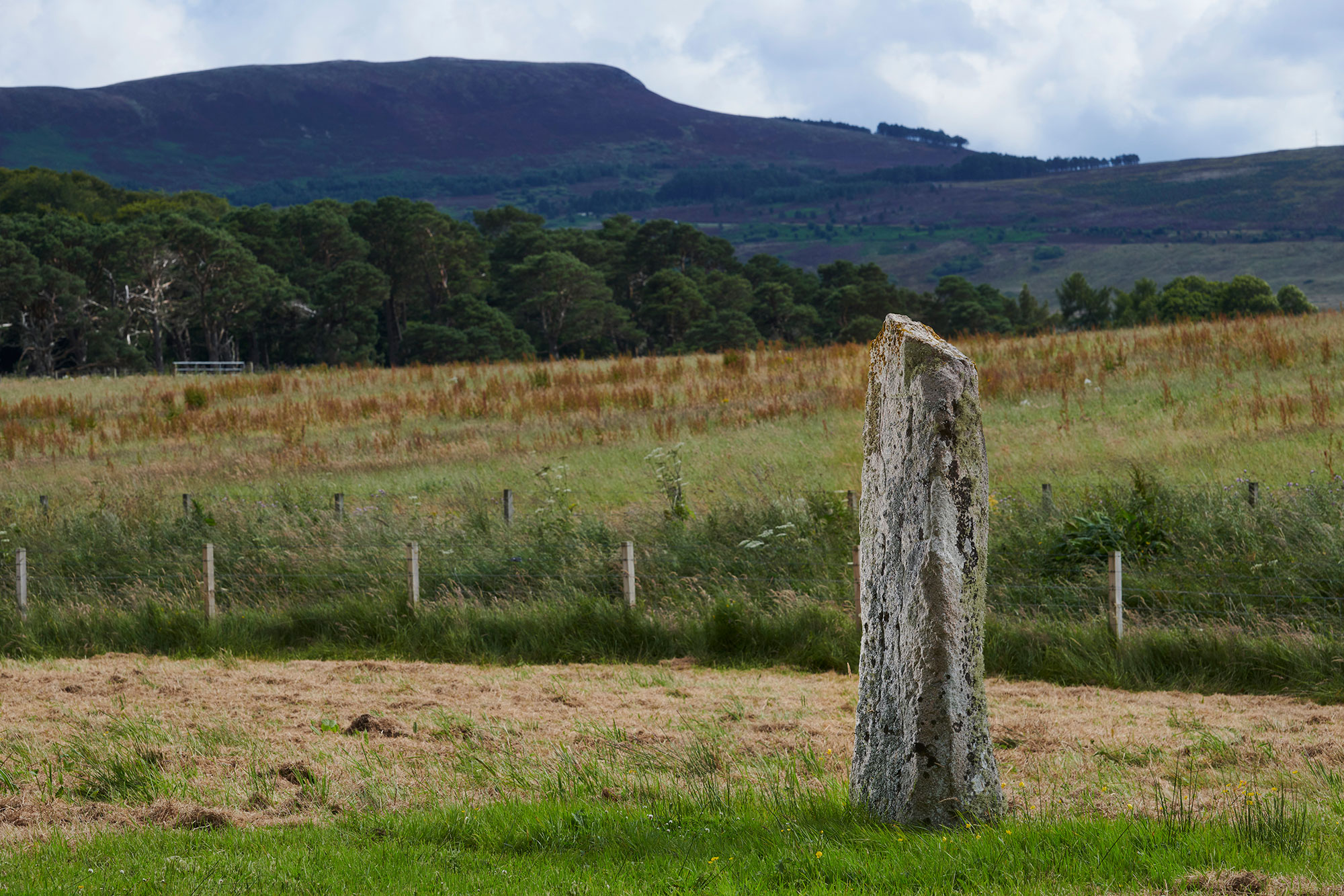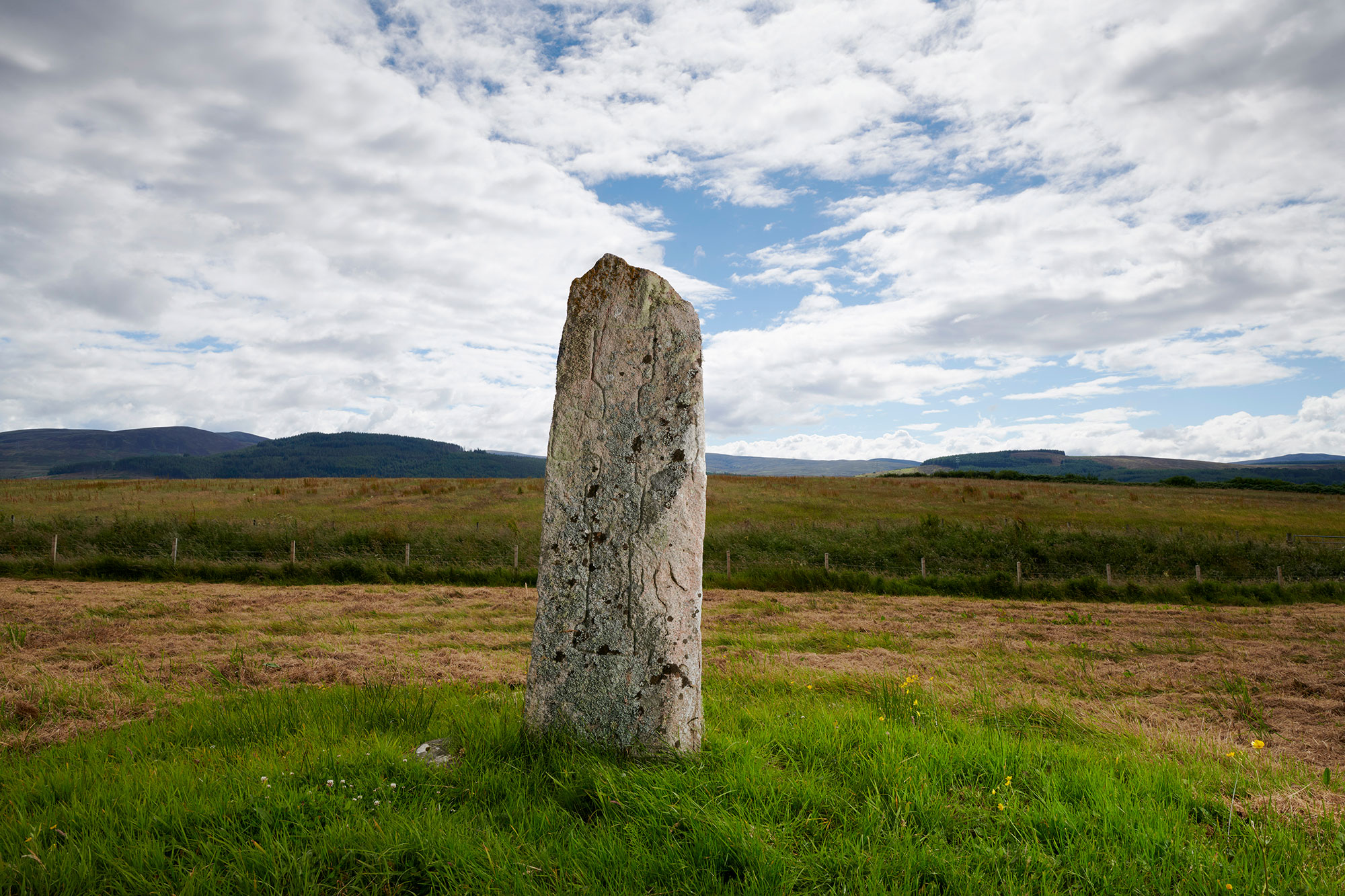 Information panel located at entrance to Little Creich cemetery which is also the best place to park. To reach the stone, follow the path through the cemetery from the carpark, go through gate and walk to brown sign marker at layby end. The stone is located through gate and 100m across rough grazing land.