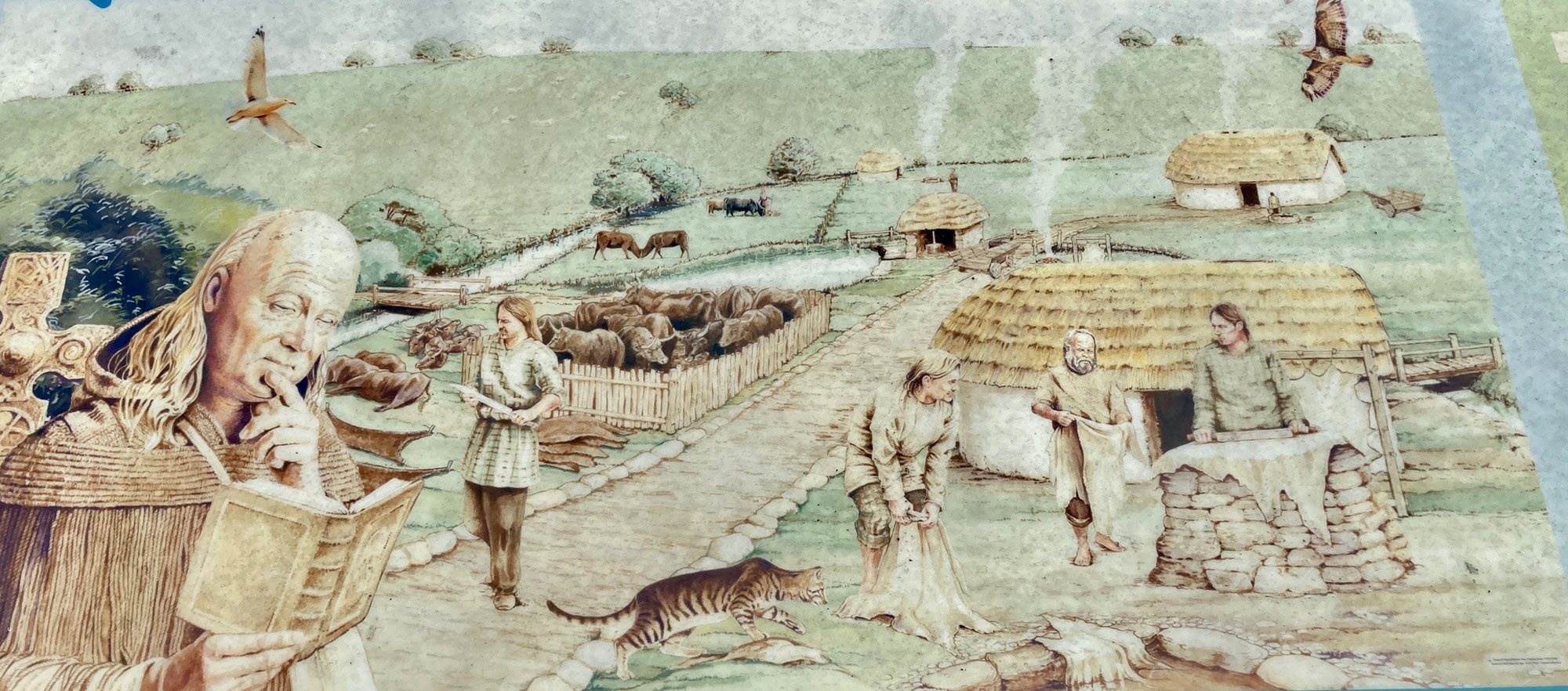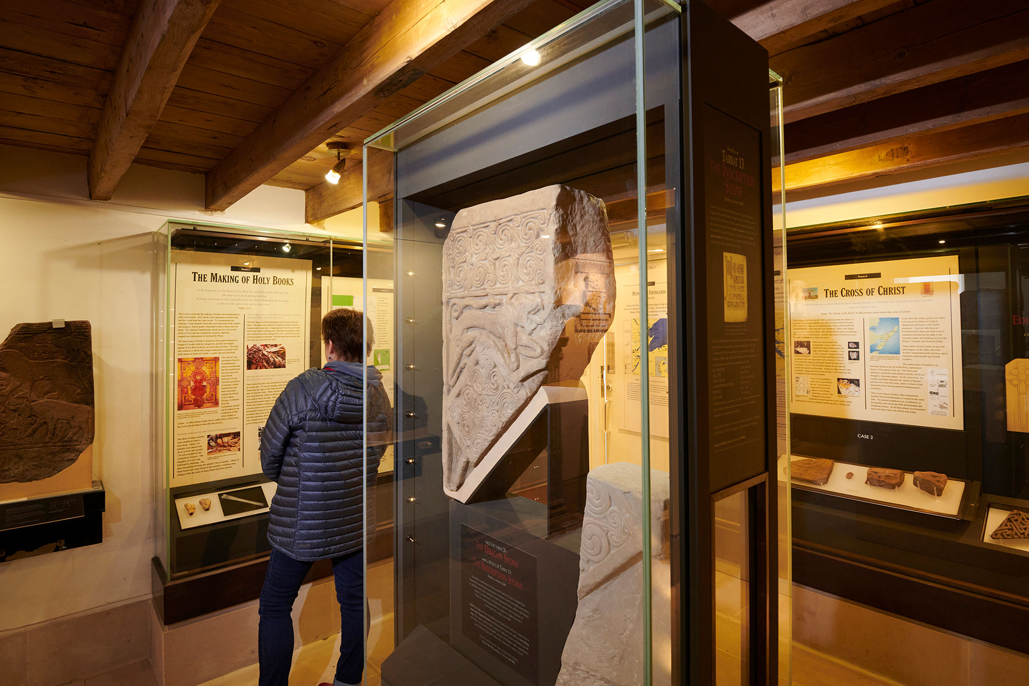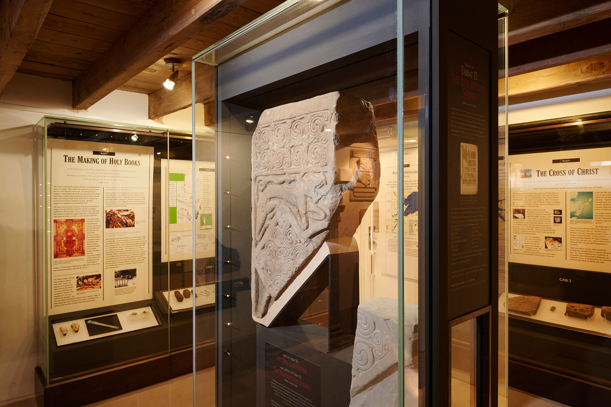 The Discovery Centre displays include intricate Pictish stone carvings with detailed geometric patterns and images including cattle licking their new-born calf, a rooting wild boar, and a snarling dragon with a serpent head on its tail. Replicas and photographs of pieces of Pictish sculpture from Tarbat which are now in the Museum of Scotland in Edinburgh are also on display along with tools used by the monks to create sacred gold and silverware, and the only evidence in Europe of a workshop producing vellum (calf skin which was used in medieval times as the writing surface for illuminated manuscripts).