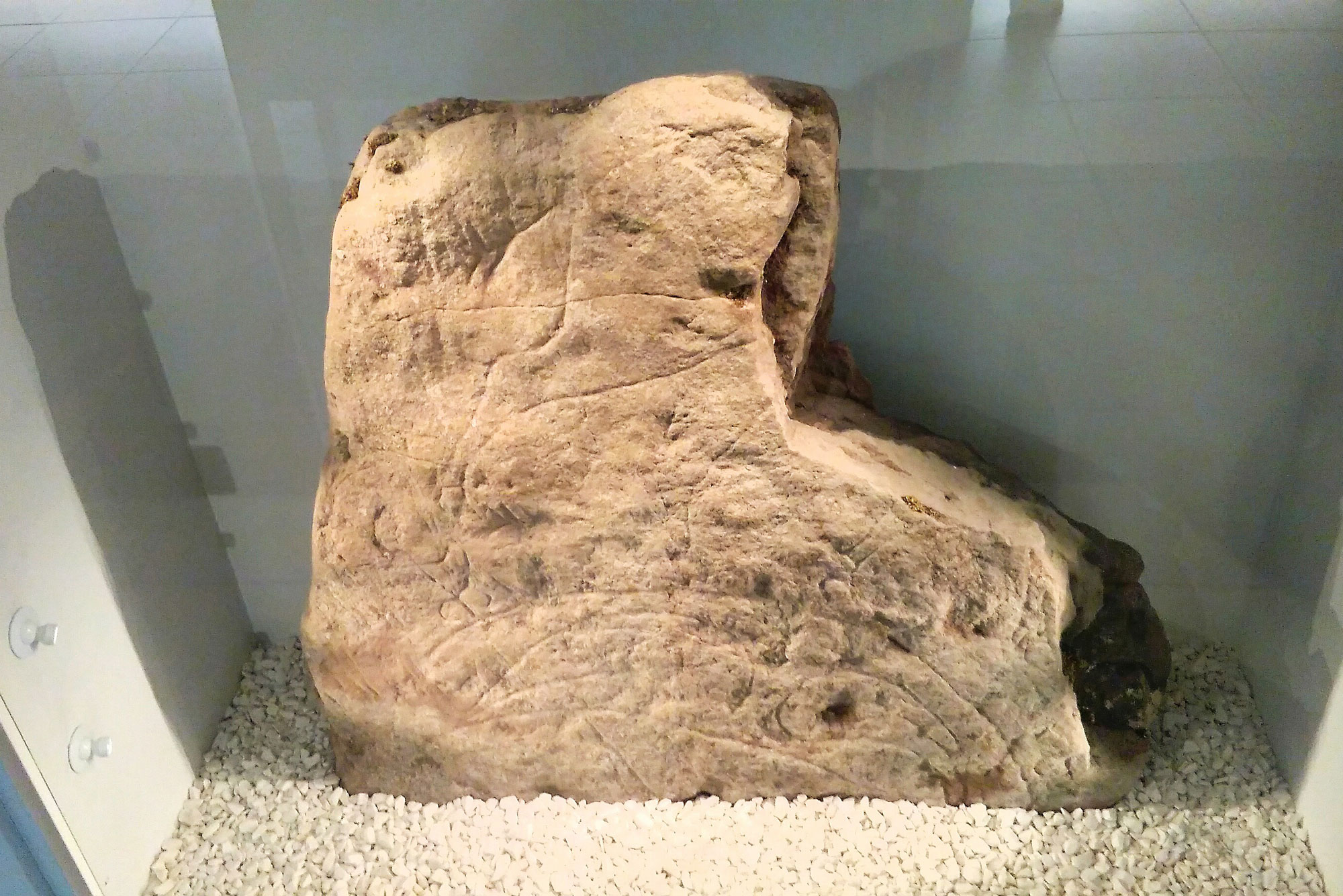Now on display in Timespan Museum, it features carvings showing the hindquarters of a boar or stag in the upper portion, and a crescent and v-rod Pictish symbol in the lower portion.
